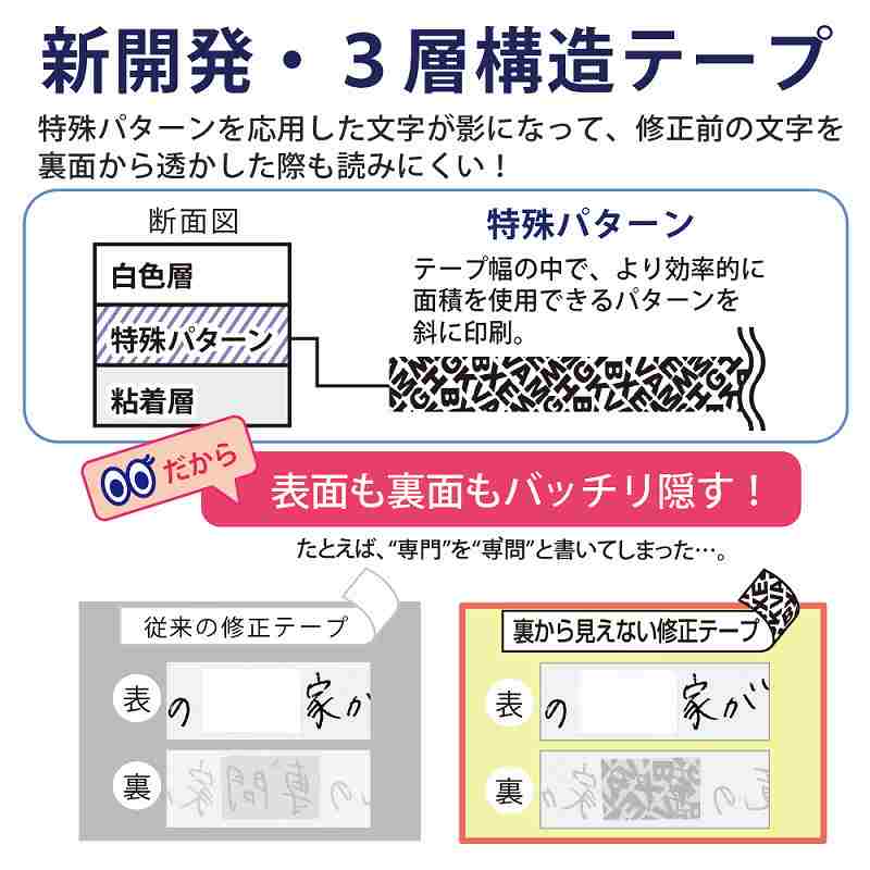 - 裏からも読み取りにくい、透かし見防止の修正テープ!