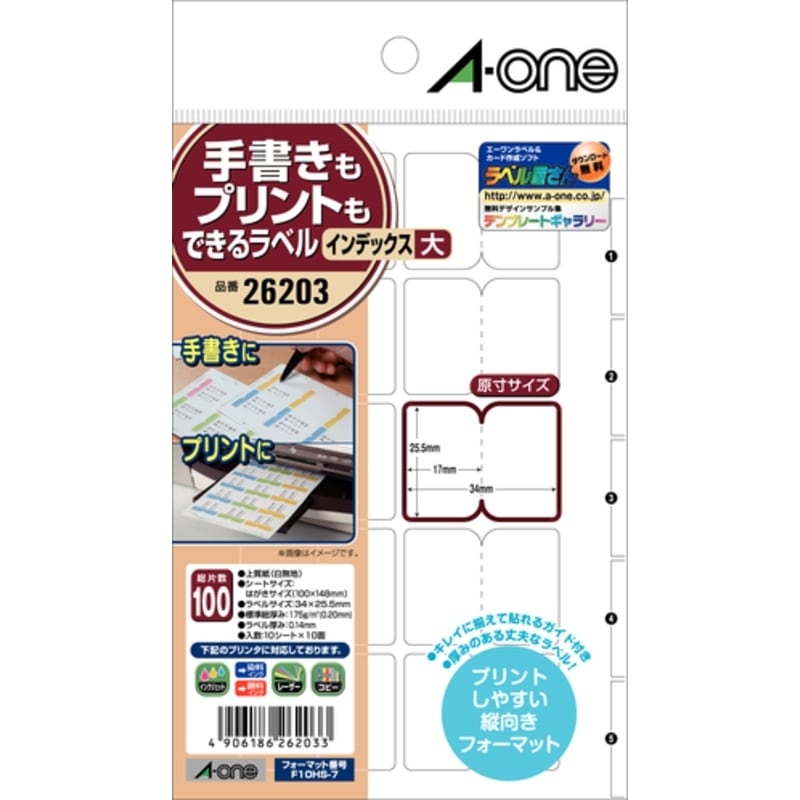 エーワン 手書きもプリントもできるラベルインデックス 大 はがきサイズ 10面 10シート 26203 3M ラベルシール