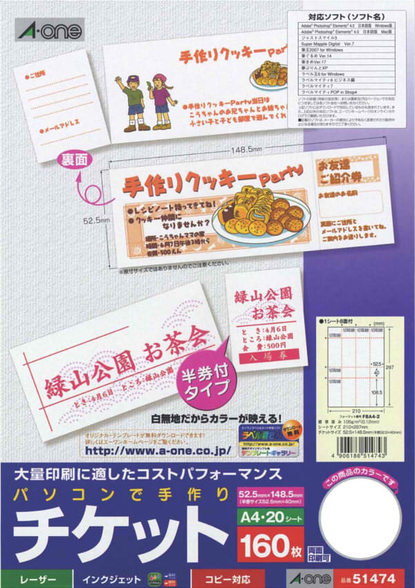 エーワン パソコンで手作りチケット 半券付 各種プリンタ兼用紙 ホワイト A4サイズ 8面 20シート(160枚分) 51474 3M